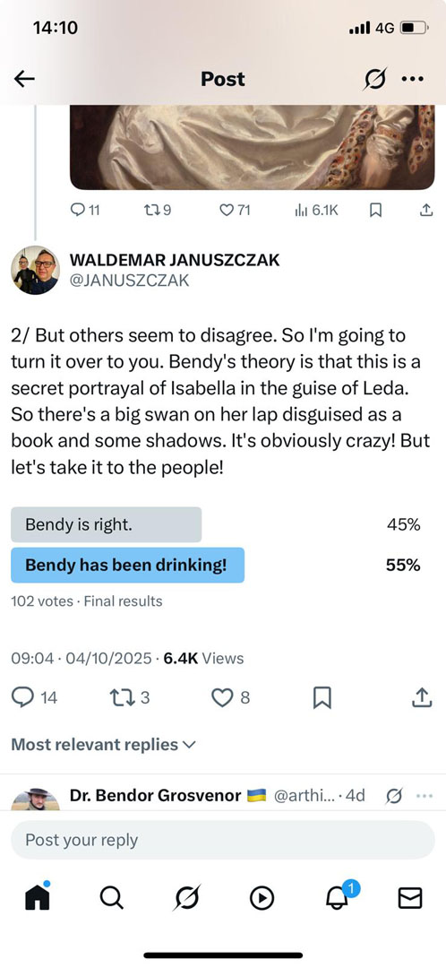 Waldy's twitter poll on whether Bendy is right in seeing the swan in the Portrait of Isabella Wolff by Sir Thomas Lawrence