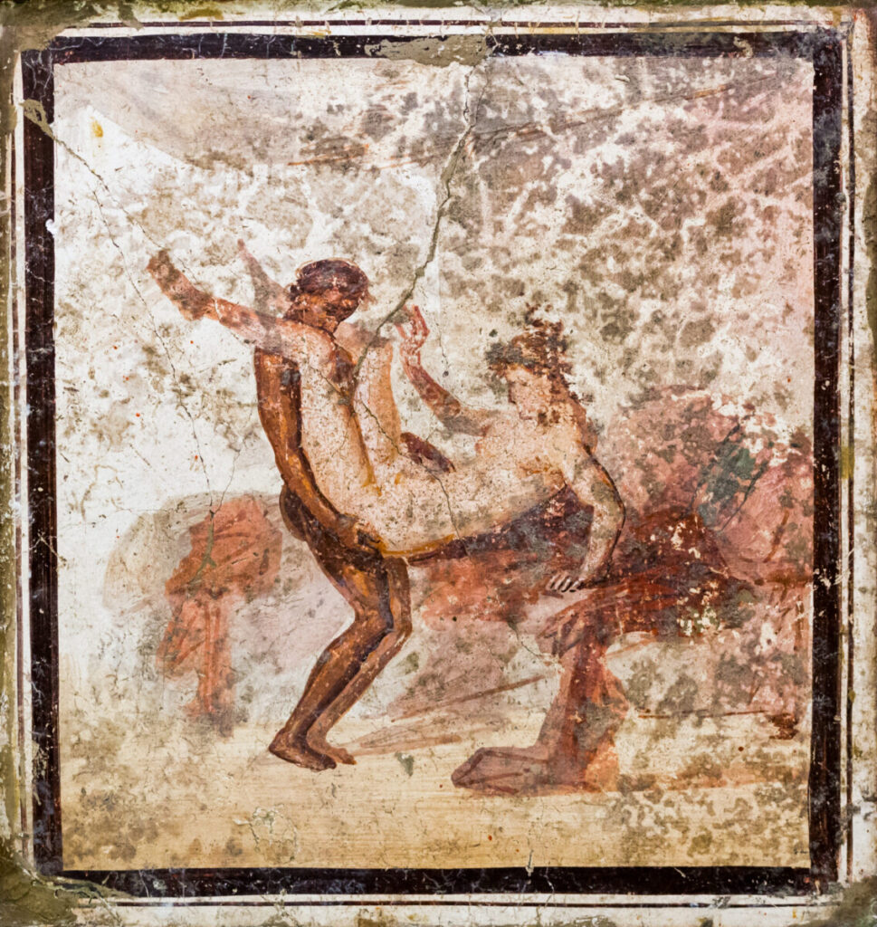 Anal sex between two males. Figure on the left is holding a hoop. 5th century BCE. Photo by Miguel Hermoso Cuesta - Own work, CC BY-SA 4.0, https://commons.wikimedia.org/w/index.php?curid=37409342