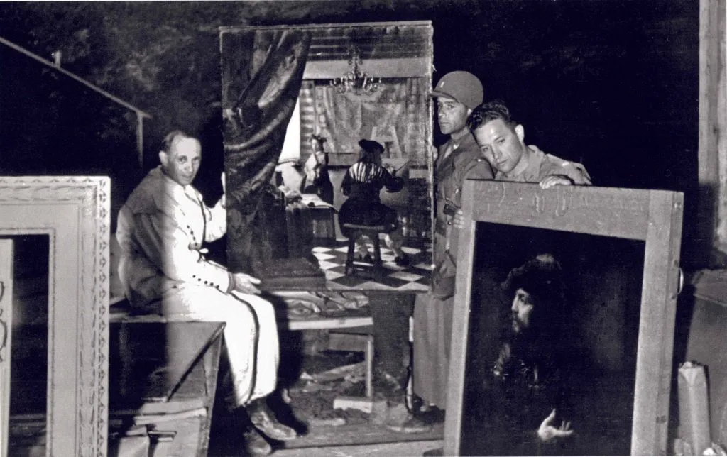 Max Eder and American Monuments Men recovering Johannes Vermeer’s The Art of Painting and Willem Drost’s Man With a Plumed Red Beret from the salt mines of Altaussee, Austria, 1945. Photo: courtesy Agnews Gallery